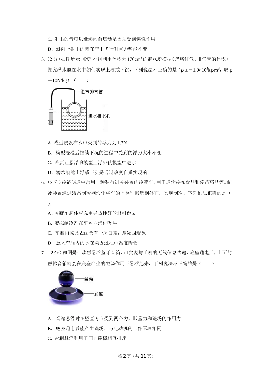 2021年陕西省中考物理试卷一、选择题(共10小题,每小题2分,计20分。每小题只有一个选项是符合题意的)1.(2分)下列微粒的尺度最大的是()A.电子B.质子C.原子核D.原子2.(2分)学校艺术节的合唱比赛中,...
