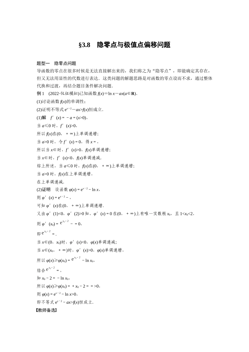 2023年高考数学一轮复习(全国版理) 第3章 3.8 隐零点与极值点偏移问题.docx