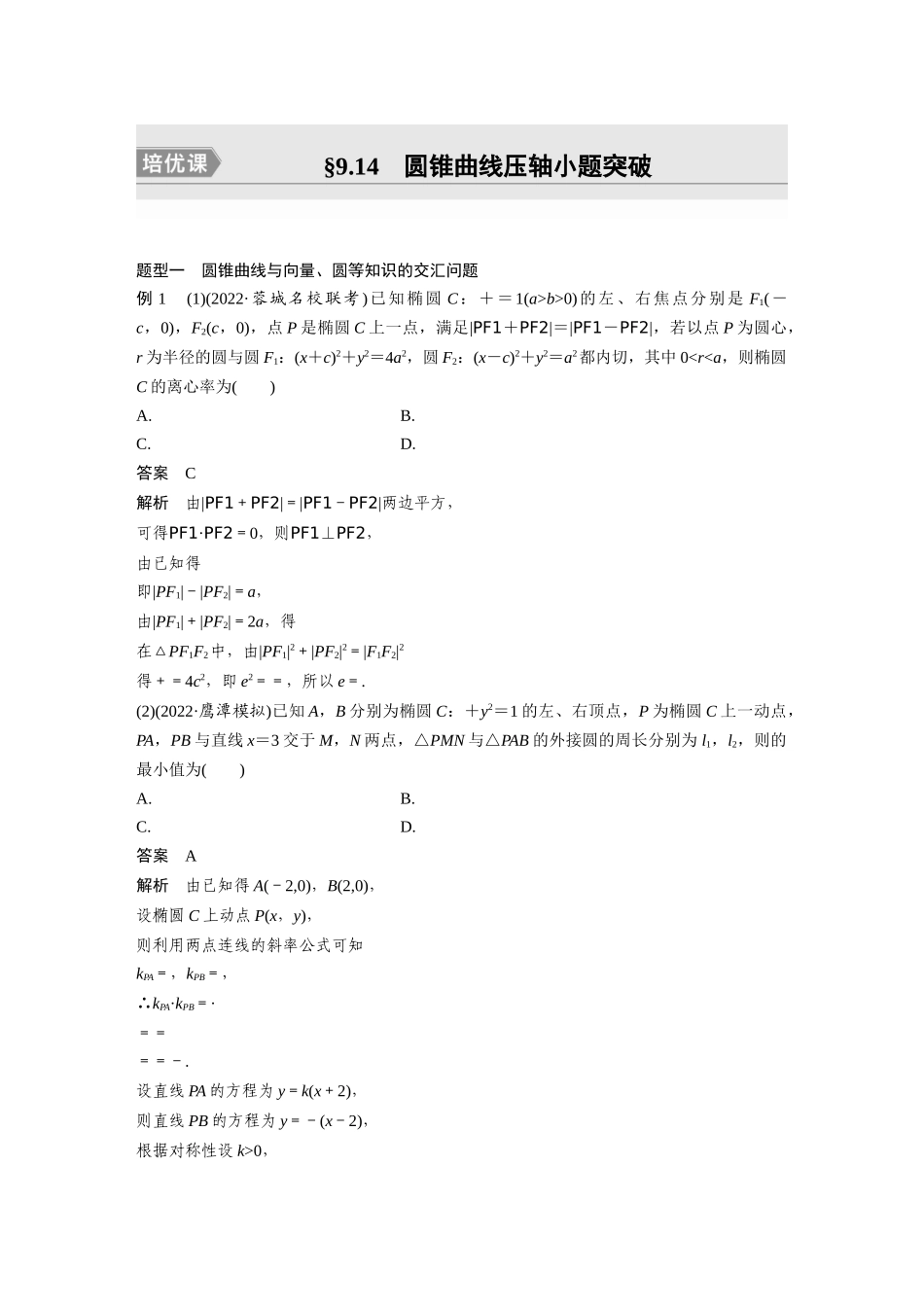 §9.14圆锥曲线压轴小题突破题型一圆锥曲线与向量、圆等知识的交汇问题例1(1)(2022·蓉城名校联考)已知椭圆C:+=1(a>b>0)的左、右焦点分别是F1(-c,0),F2(c,0),点P是椭圆C上一点,满足|PF1+PF2|=|PF1-PF...