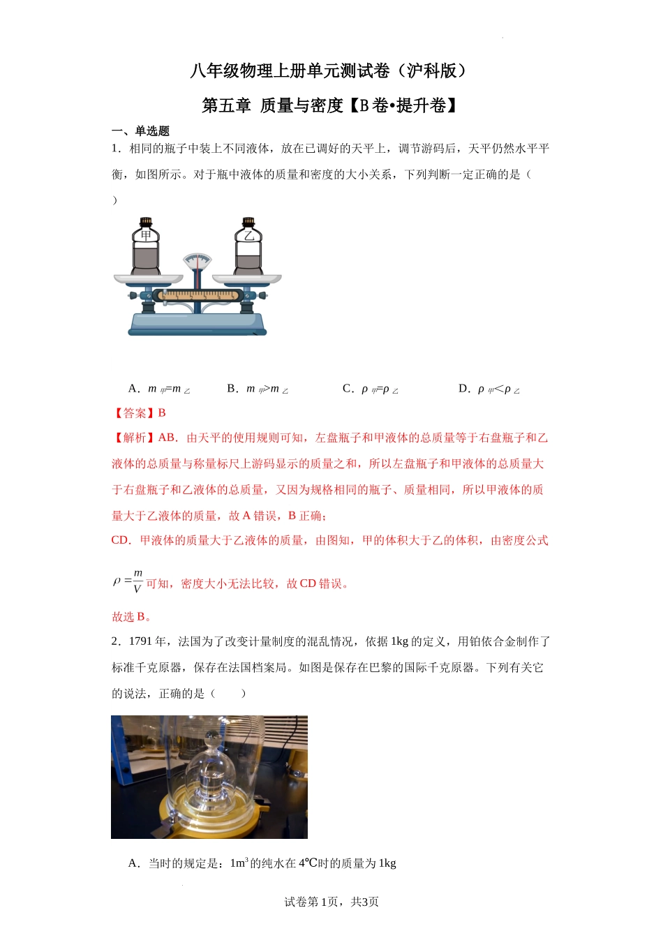 【沪科物理下册】第五章质量与密度【单元测试B卷-提升卷】-(解析版).docx_第1页