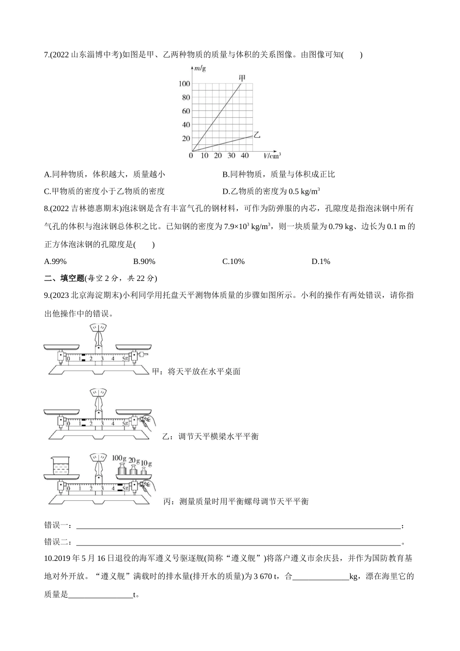第六章质量与密度综合检测(满分100分,限时45分钟)一、选择题(每题4分,共32分)1.(2022山东单县期末)关于物体的质量,下列分析中正确的是()A.载人飞船进入太空后,质量变为零B.一块铜的温度从0℃升高到60℃,铜的...
