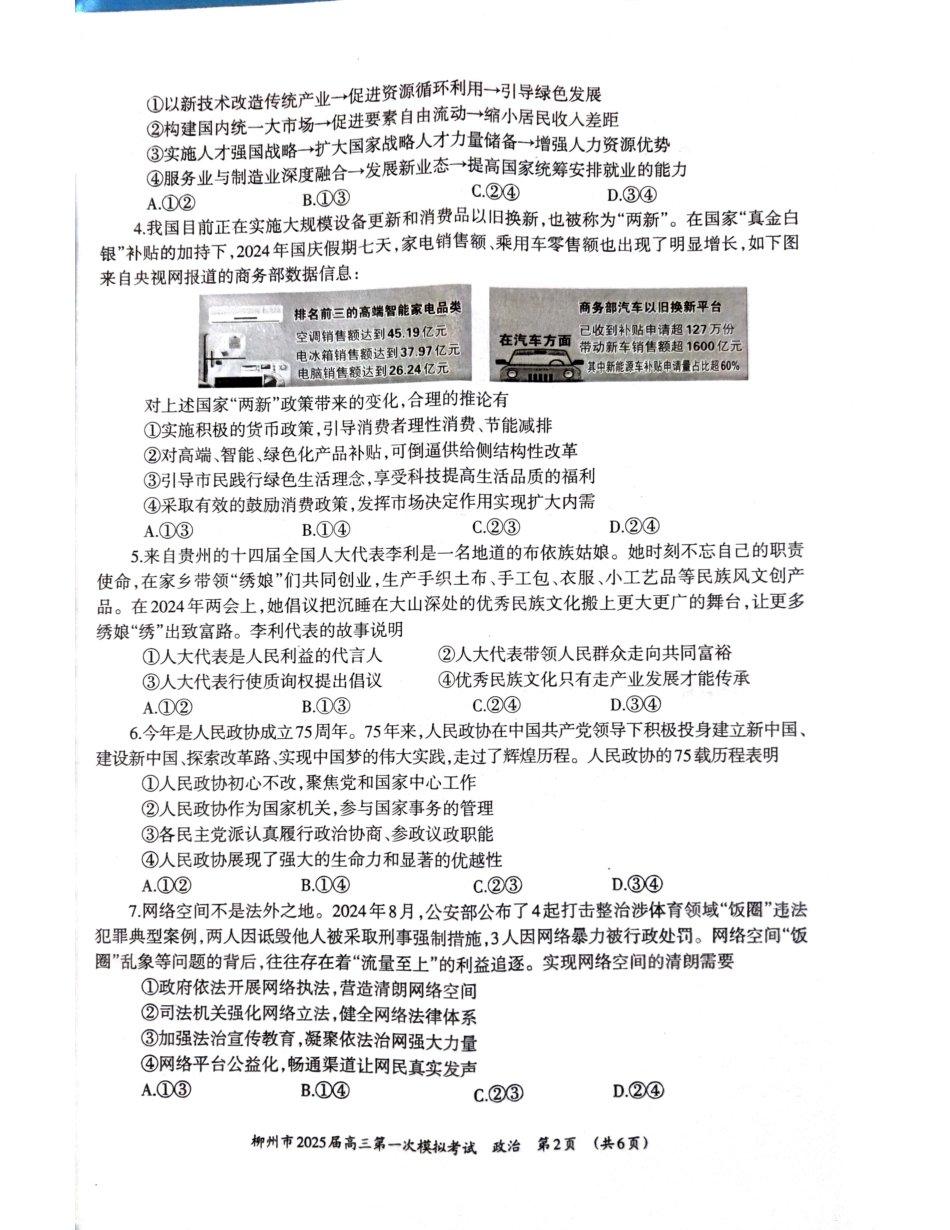 2025届广西壮族自治区柳州市高三上学期一模政治试题.pdf_第2页