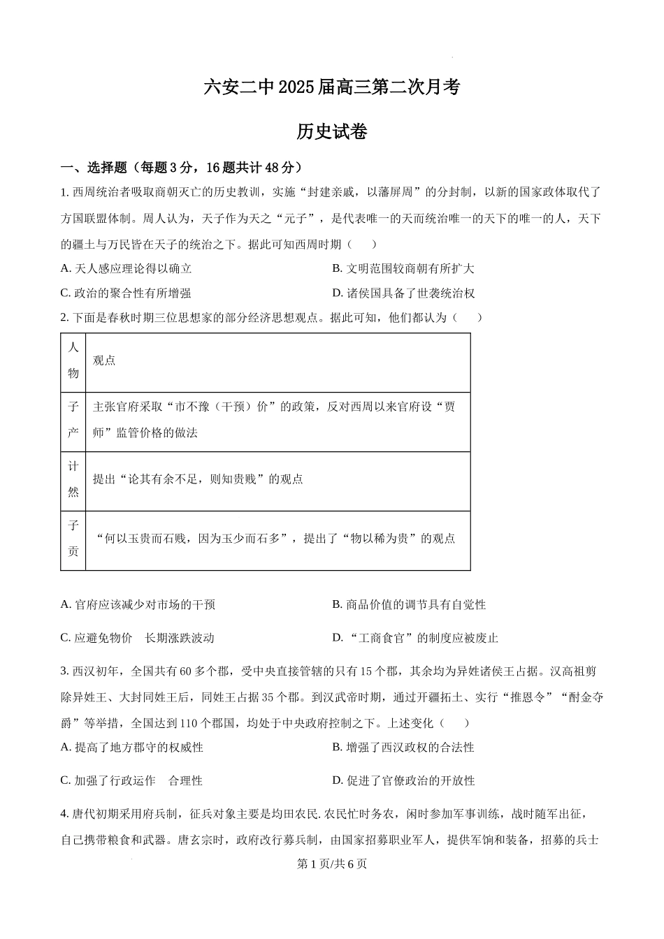 六安二中2025届高三第二次月考历史试卷一、选择题(每题3分,16题共计48分)1.西周统治者吸取商朝灭亡的历史教训,实施“封建亲戚,以藩屏周”的分封制,以新的国家政体取代了方国联盟体制。周人认为,天子作为天...