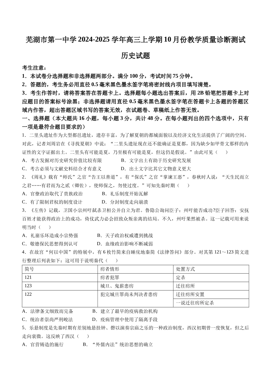 芜湖市第一中学2024-2025学年高三上学期10月份教学质量诊断测试历史试题考生注意:1.本试卷分选择题和非选择题两部分。满分100分,考试时间75分钟。2.答题的,考生务必用直径0.5毫米黑色墨水签字笔将密封线内项...