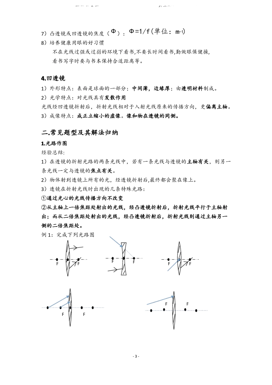 第六章:常见的光学仪器一.基本知识点归纳:1.凸透镜:有两个虚焦点。1)外观:表面是球面的一部分,中间厚,边缘薄,由透明材料制成。2)光学特点:对光线具有会聚作用①正确看待凸透镜对光线的会聚作用:光线经透...