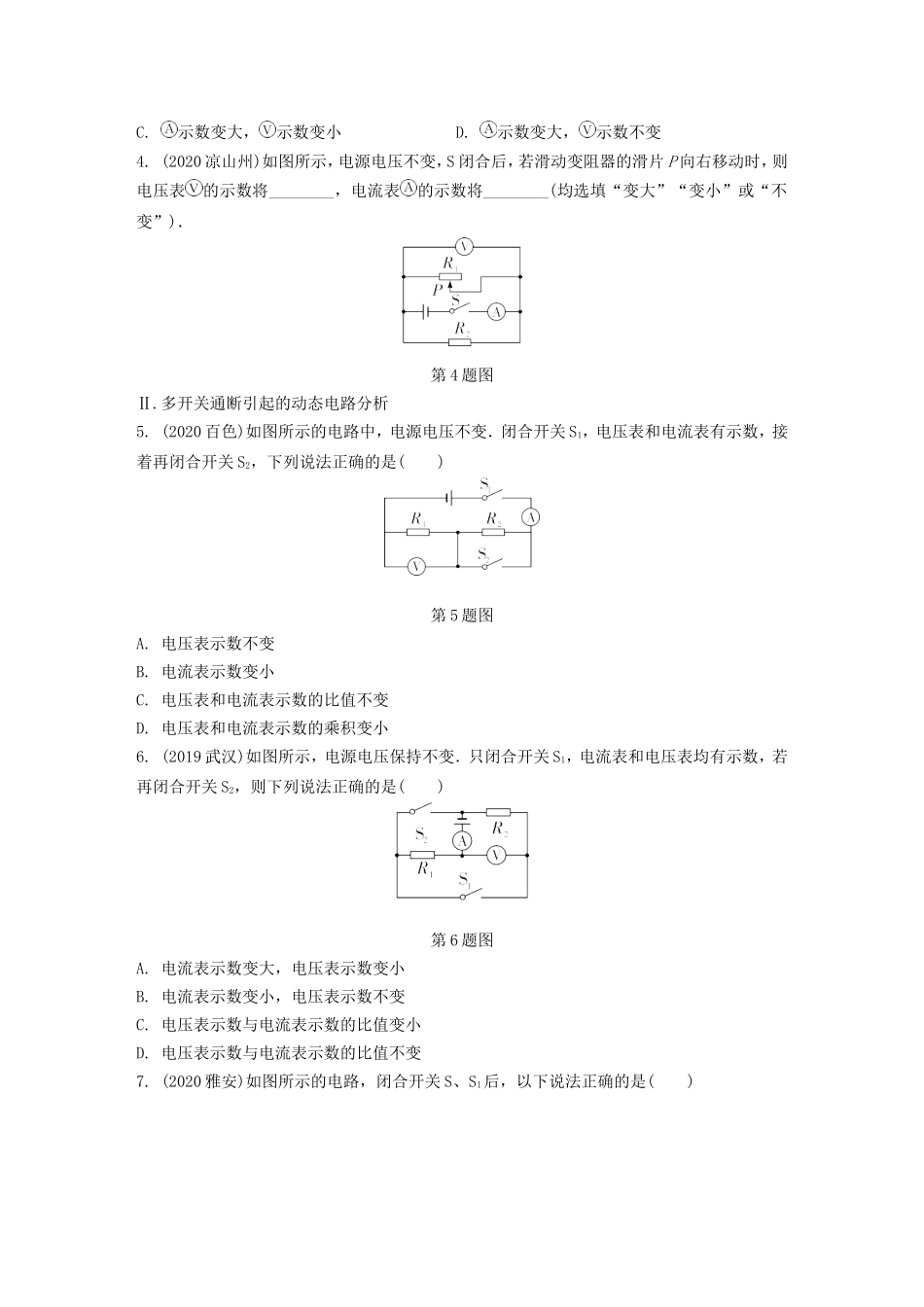 分类集训14欧姆定律命题点分类集训命题点1动态电路分析Ⅰ.滑动变阻器滑片移动引起的动态电路分析1.(2020安徽)在如图所示的电路中,电源电压保持不变.闭合开关S后,将滑动变阻器的滑片P自左向右滑动,则()第1题图...