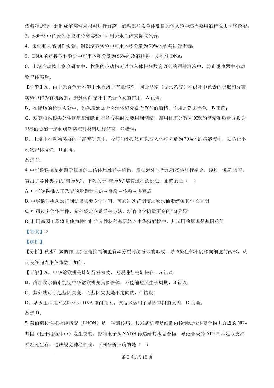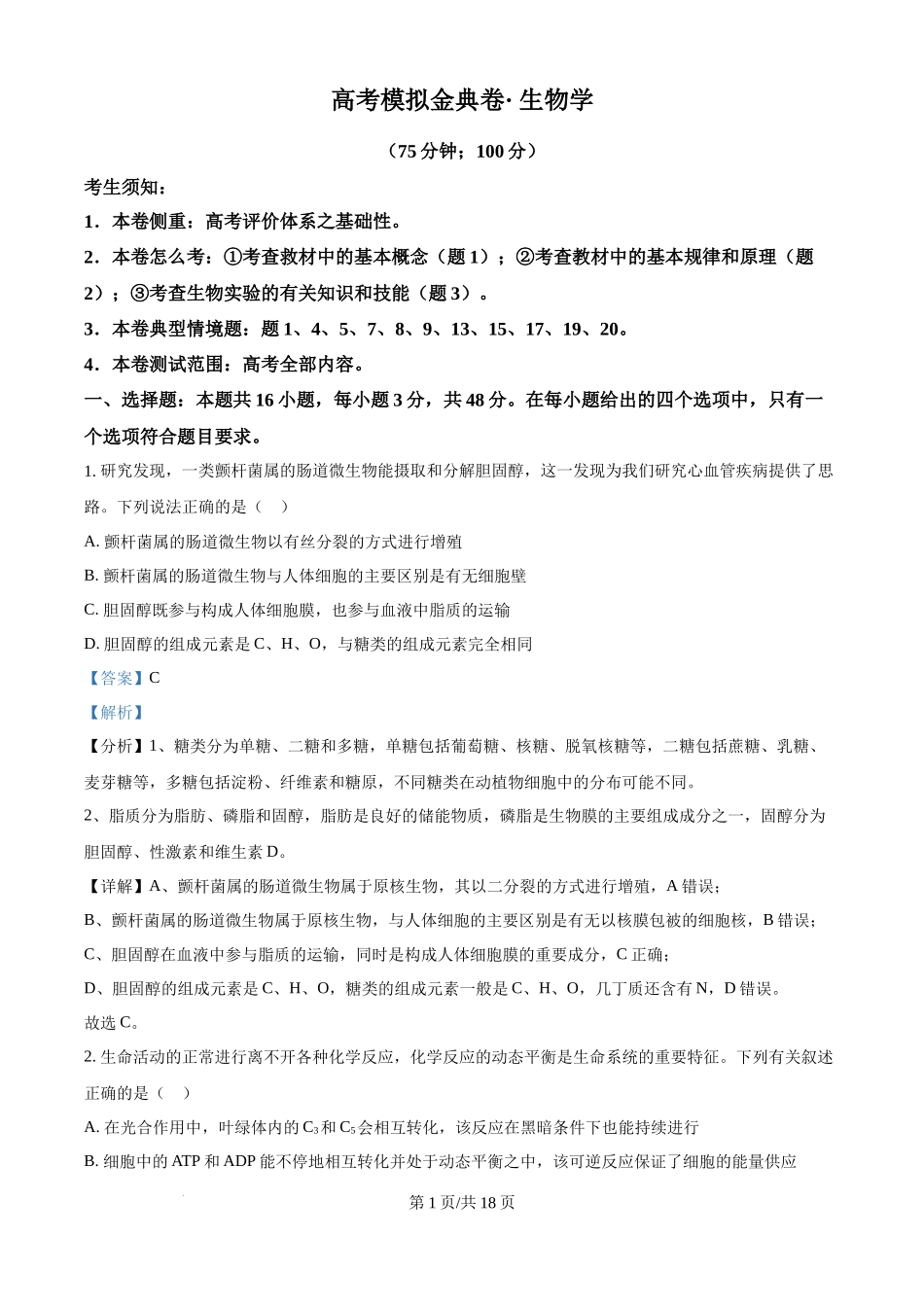 高考模拟金典卷·生物学(75分钟;100分)考生须知:1.本卷侧重:高考评价体系之基础性。2.本卷怎么考:①考查救材中的基本概念(题1);②考查教材中的基本规律和原理(题2);③考查生物实验的有关知识和技能...