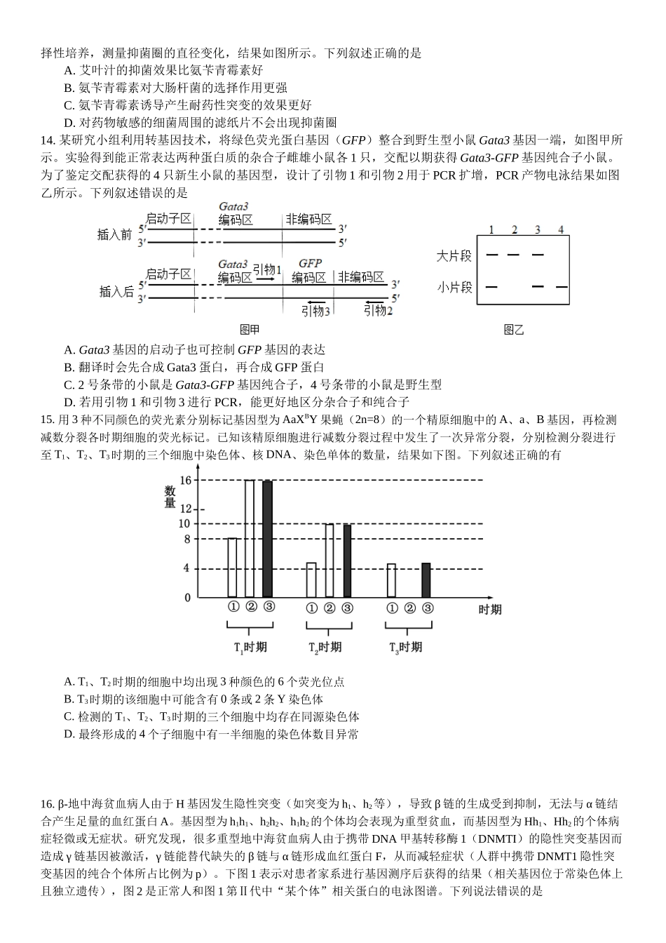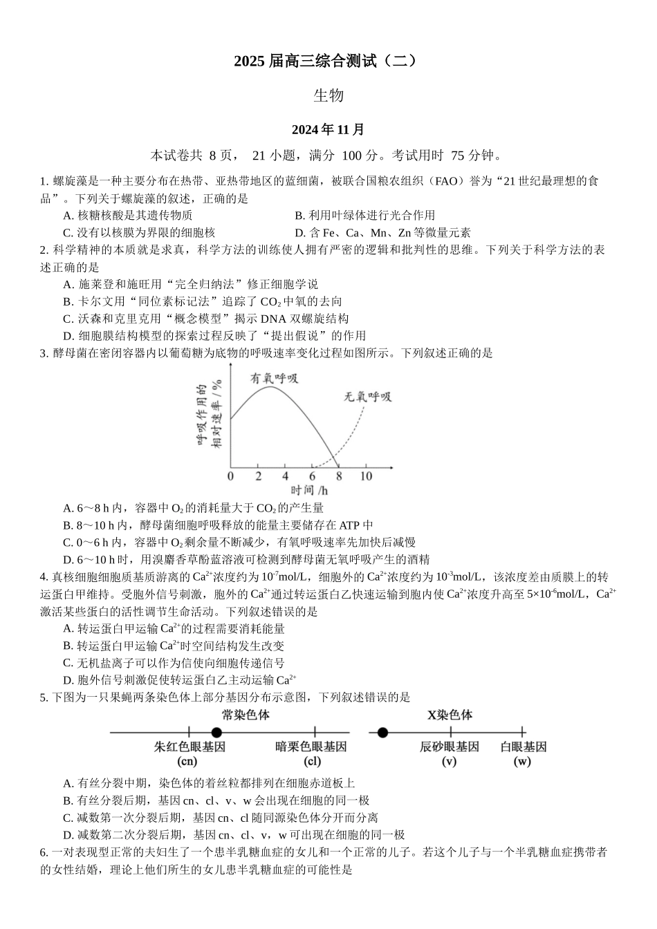 2025届高三综合测试(二)生物2024年11月本试卷共8页,21小题,满分100分。考试用时75分钟。1.螺旋藻是一种主要分布在热带、亚热带地区的蓝细菌,被联合国粮农组织(FAO)誉为“21世纪最理想的食品”。下列关于螺...