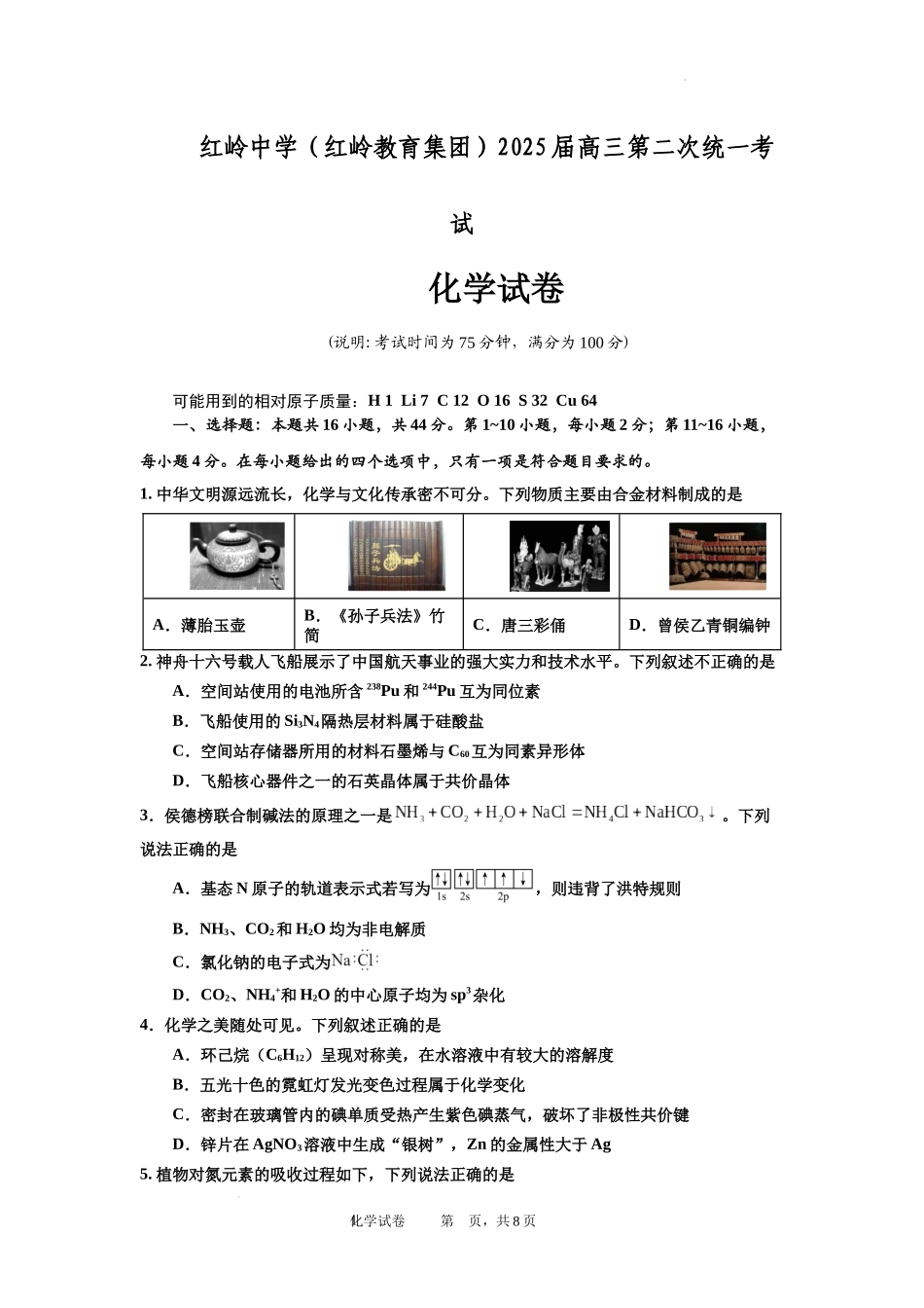 广东省深圳市福田区红岭中学2024-2025学年高三上学期第二次统一考试化学.docx_第1页