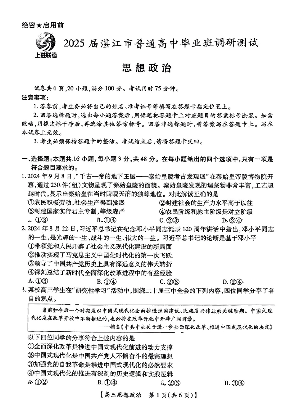 广东省湛江市2024-2025学年高三上学期高中毕业生调研考试思想政治试卷含答案.pdf_第1页