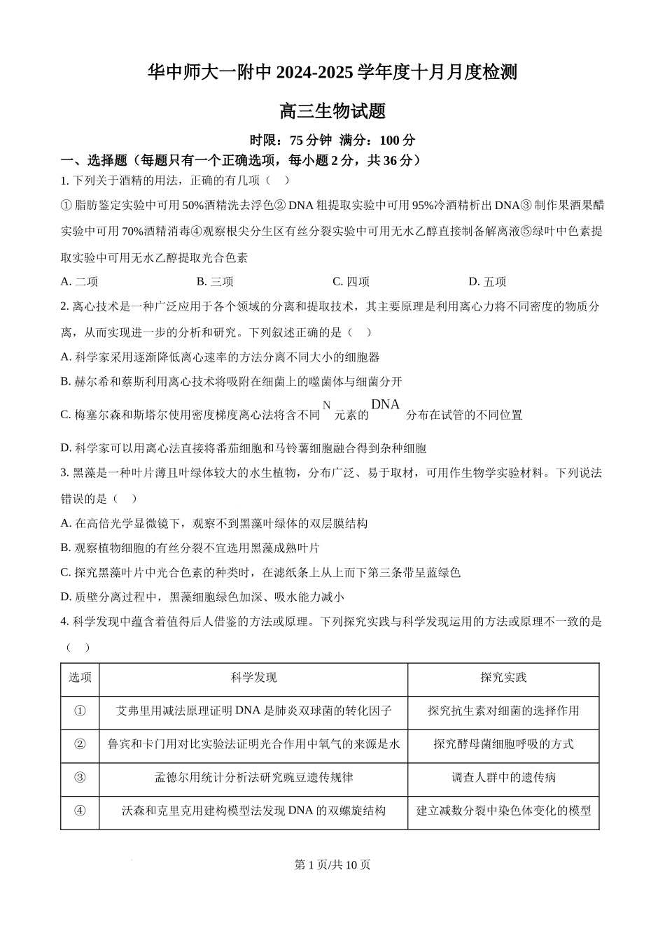 华中师大一附中2024-2025学年度十月月度检测高三生物试题时限:75分钟满分:100分一、选择题(每题只有一个正确选项,每小题2分,共36分)1.下列关于酒精的用法,正确的有几项()①脂肪鉴定实验中可用50%酒精洗...