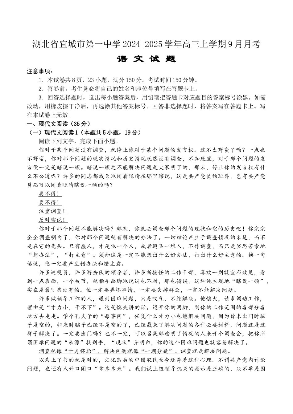 湖北省宜城市第一中学2024-2025学年高三上学期9月月考语文试题注意事项:1.本试卷共8页,23小题,满分150分。考试时间150分钟。2.答卷前,考生务必将自己的姓名和座位号填写在答题卡上。3.回答选择题时,选出每小...