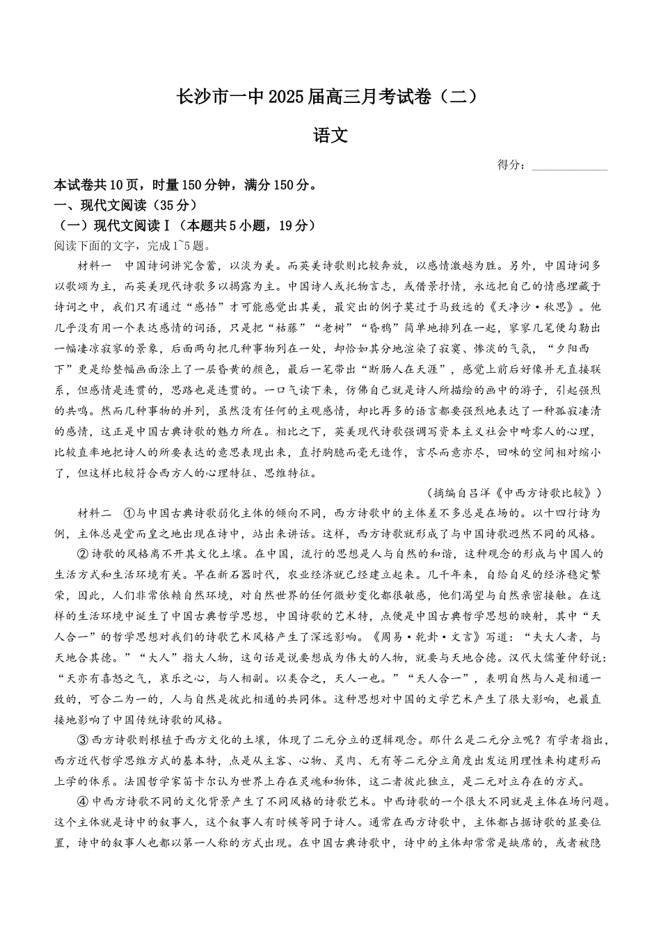 长沙市一中2025届高三月考试卷(二)语文得分:_____________本试卷共10页,时量150分钟,满分150分。一、现代文阅读(35分)(一)现代文阅读Ⅰ(本题共5小题,19分)阅读下面的文字,完成1~5题。材料一中国诗词...