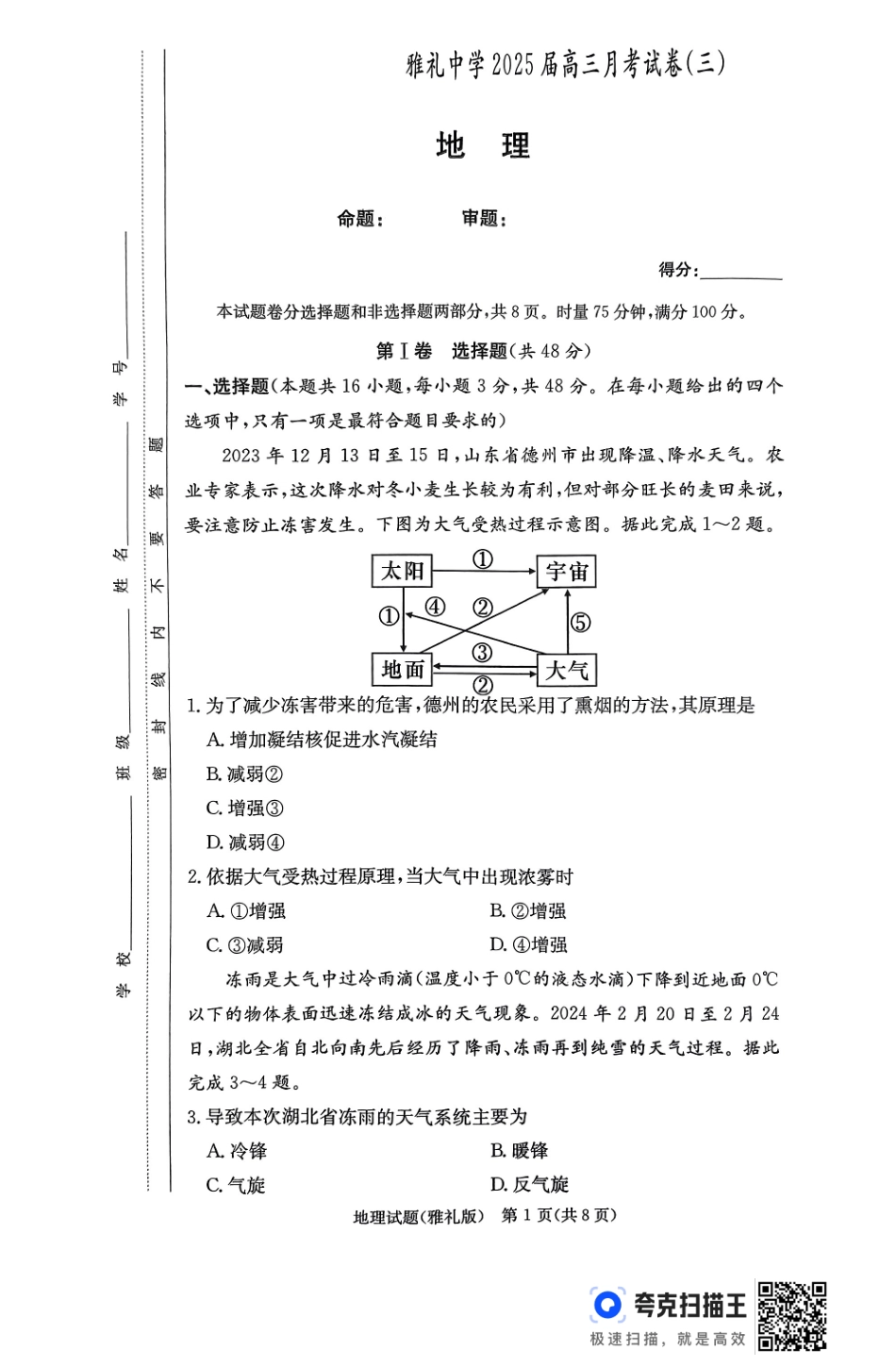 湖南省长沙市雅礼中学2024-2025学年高三上学期月考(三)地理试题含答案.pdf_第3页