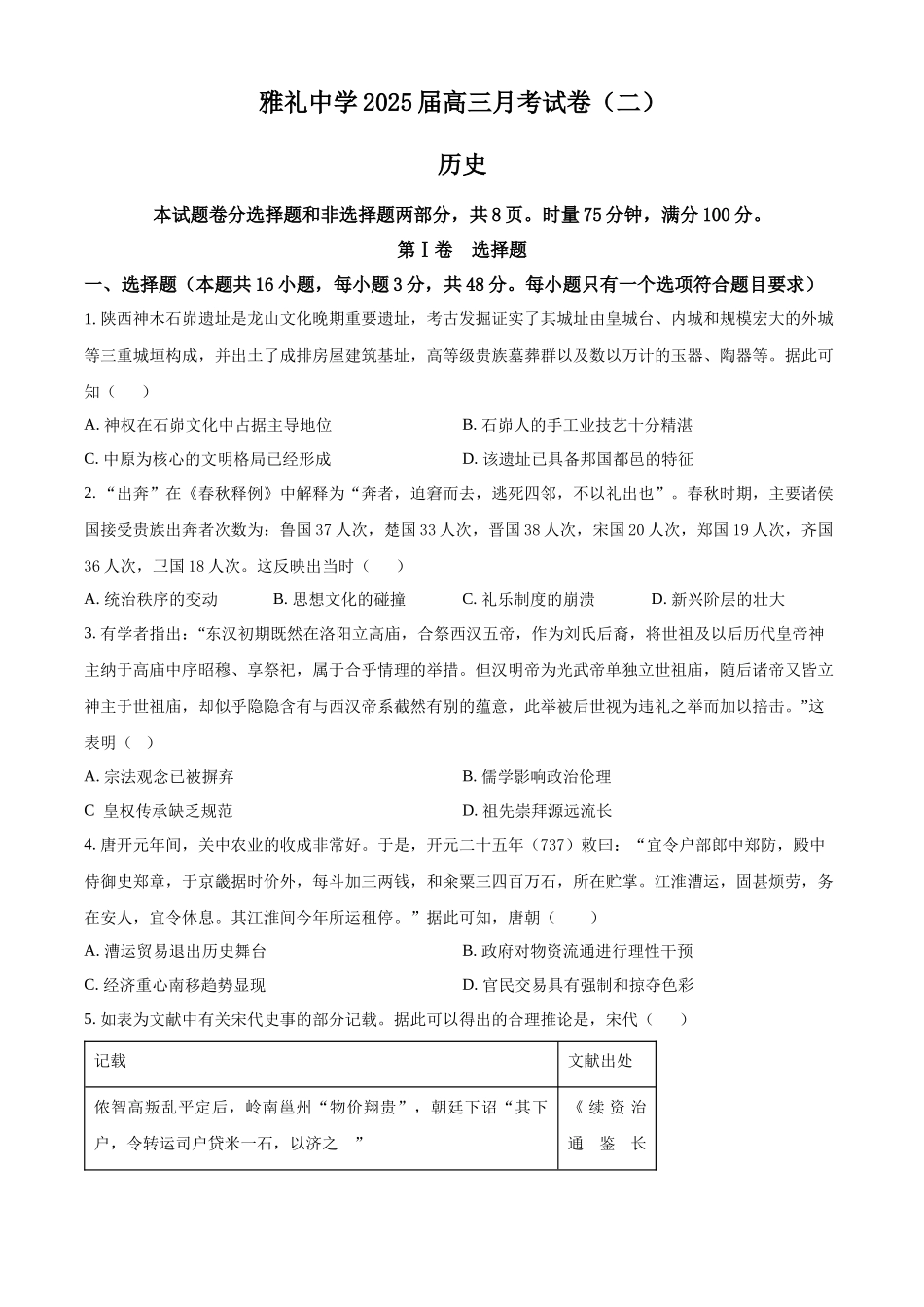 雅礼中学2025届高三月考试卷(二)历史本试题卷分选择题和非选择题两部分,共8页。时量75分钟,满分100分。第Ⅰ卷选择题一、选择题(本题共16小题,每小题3分,共48分。每小题只有一个选项符合题目要求)1.陕西神...