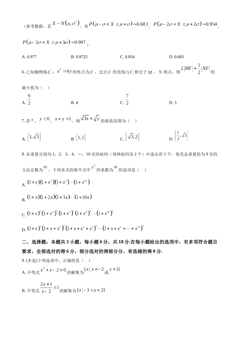 雅礼中学2025届高三月考试卷(二)数学命题人:周芳芳张博审题人:周芳芳伊波得分:______本试卷分第Ⅰ卷(选择题)和第Ⅱ卷(非选择题)两部分,共8页.时量120分钟,满分150分.第Ⅰ卷一、选择题:本题共8小题,...
