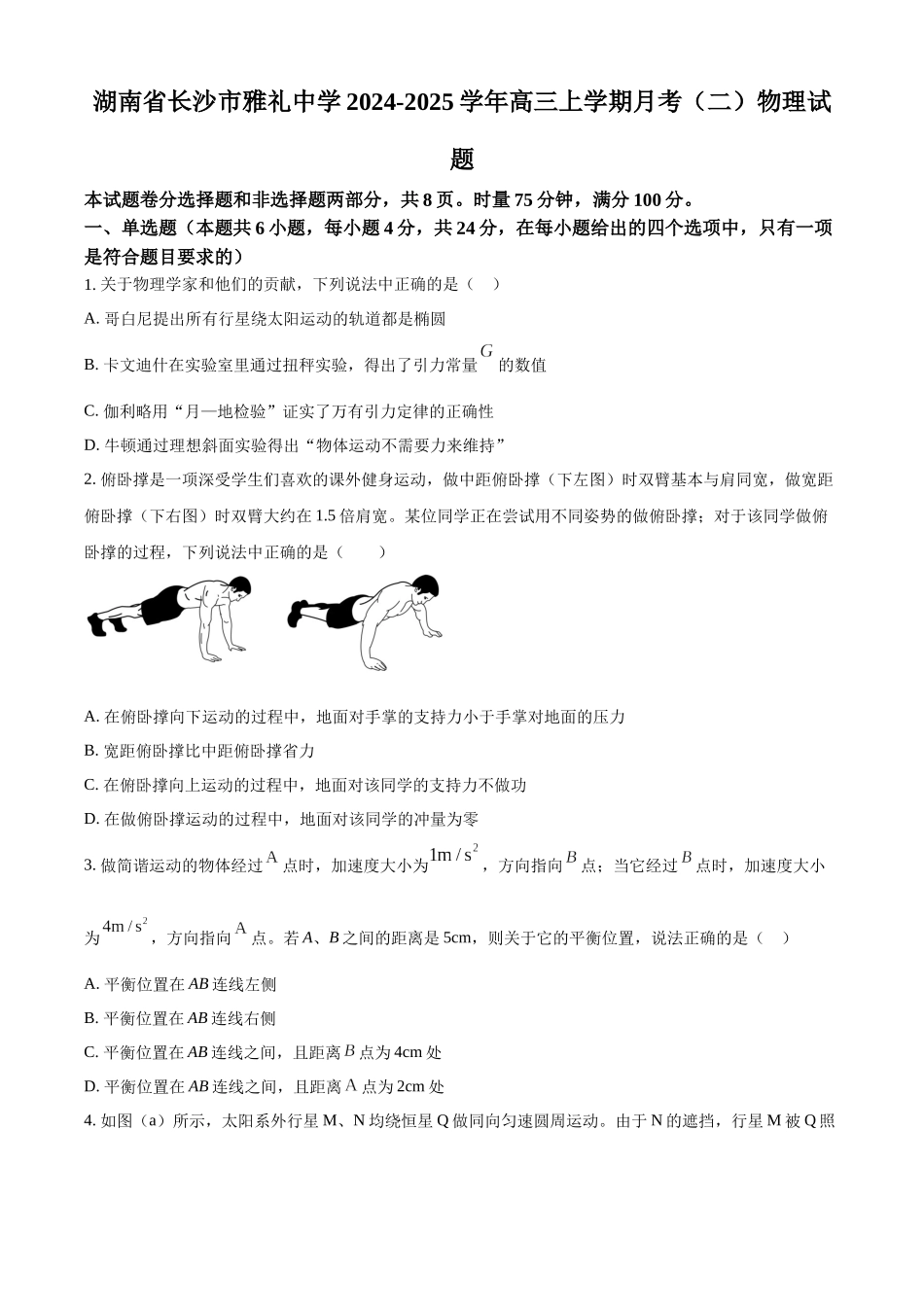 湖南省长沙市雅礼中学2025届高三上学期月考(二)物理试题.docx