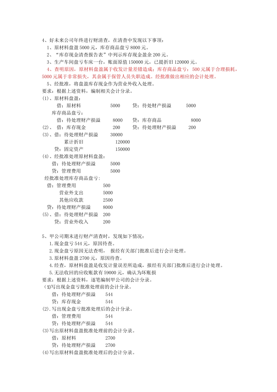 类型一:会计分录(盘盈、盘亏类)1.甲公司期末进行财产清查时,发现如下情况:(1)现金盘盈573元,原因待查。(2)现金盘盈原因无法查明,报经有关部门批准后进行会计处理。(3)盘亏设备一台,原价11700元,已提折旧9...