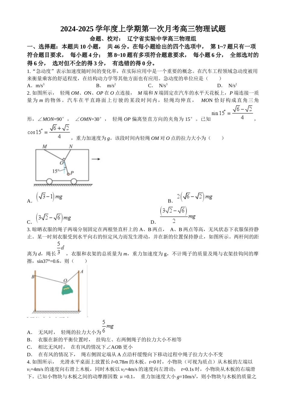 2024-2025学年度上学期第一次月考高三物理试题命题、校对:辽宁省实验中学高三物理组一、选择题:本题共10小题,共46分。在每小题给出的四个选项中,第1~7题只有一项符合题目要求,每小题4分;第8~10题有多项符合...