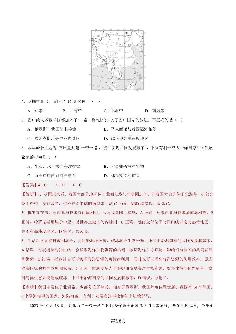 更多资料加微信:w13304227备战2024年中考地理热点专题解读与训练第三届“一带一路”国际合作高峰论坛于2023年10月17日至18日在北京举行,包括29位外国元首和政府首脑在内的140多个国家和80多个国际组织的1600余...