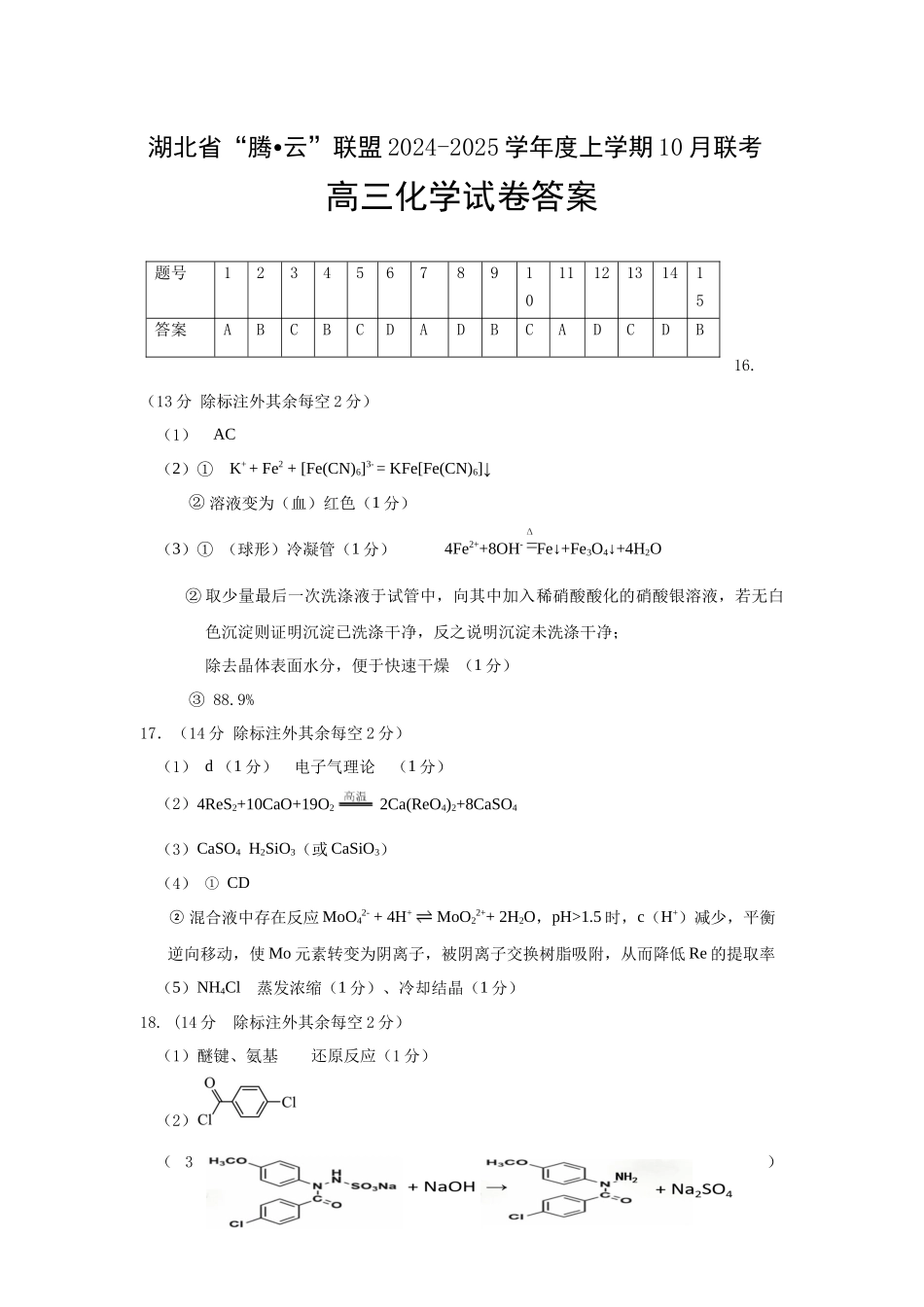 湖北省“腾云”联盟•2024-2025学年度上学期10月联考高三化学试卷答案16.(13分除标注外其余每空2分)(1)AC(2)①K++Fe2+[Fe(CN)6]3-=KFe[Fe(CN)6]↓②溶液变为(血)红色(1分)(3)①(球形)冷凝管(1分)...
