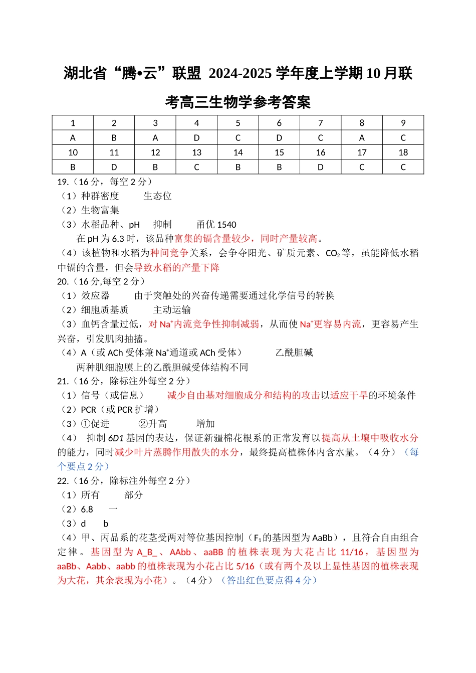 湖北省“腾云”联盟•2024-2025学年度上学期10月联考高三生物学参考答案123456789ABADCDCAC101112131415161718BDBCBBDCC19.(16分,每空2分)(1)种群密度生态位(2)生物富集(3)水稻品种、pH抑制甬优1540在pH...