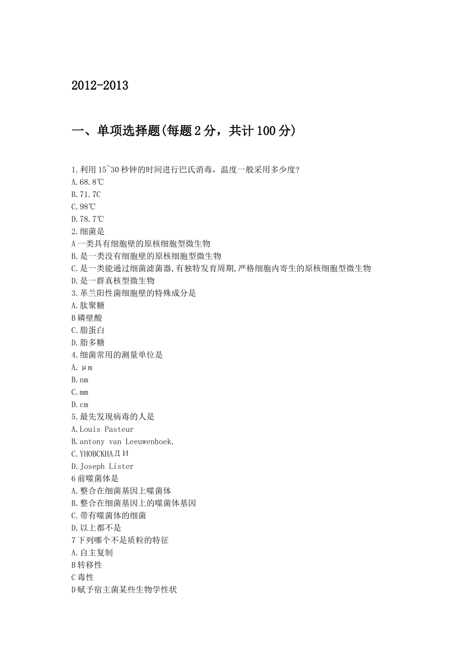 2012-2013一、单项选择题(每题2分,共计100分)1.利用15~30秒钟的时间进行巴氏消毒,温度一般采用多少度?A.68.8℃B.71.7CC.98℃D.78.7℃2.细菌是A一类具有细胞壁的原核细胞型微生物B.是一类没有细胞壁的原核细胞型...