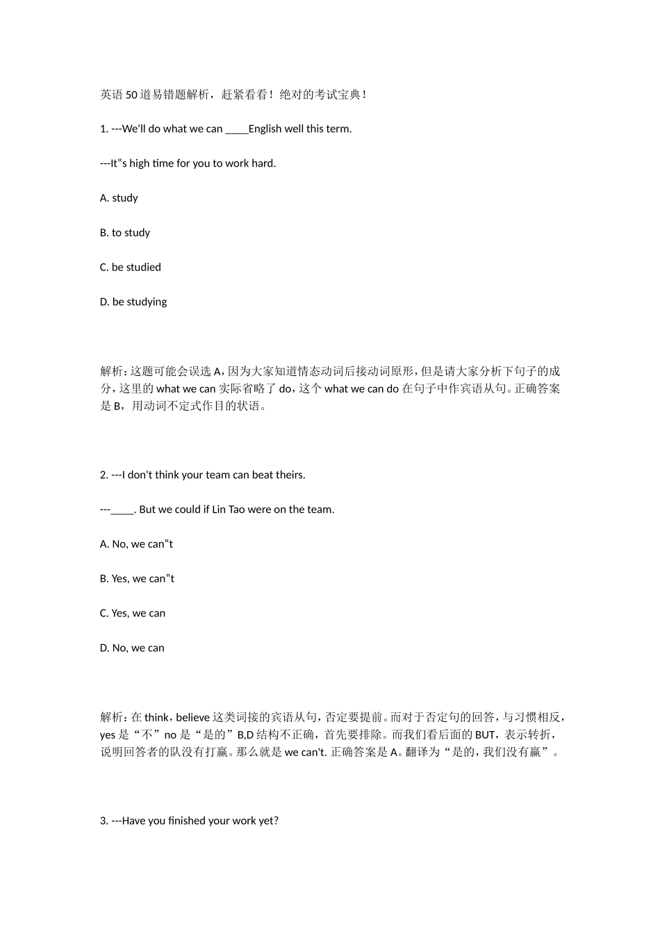 英语50道易错题解析,赶紧看看!绝对的考试宝典!1.---We'lldowhatwecan____Englishwellthisterm.---It‟shightimeforyoutoworkhard.A.studyB.tostudyC.bestudiedD.bestudying解析:这题可能会误选A,因为大家知...