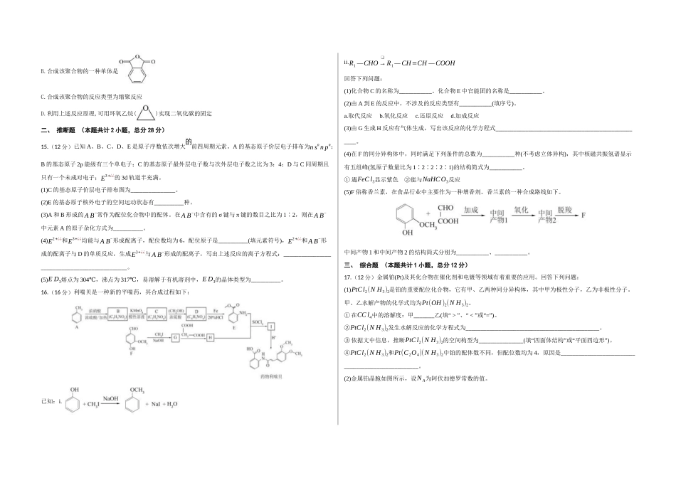 重庆市涪陵第五中学2024-2025学年高三上学期开学考试化学试题(考试总分:100分考试时长:90分钟)一、单选题(本题共计14小题,总分42分)1.生活中处处有化学。下列说法错误的是()A.液态氯乙烷汽化时吸收大量热,...
