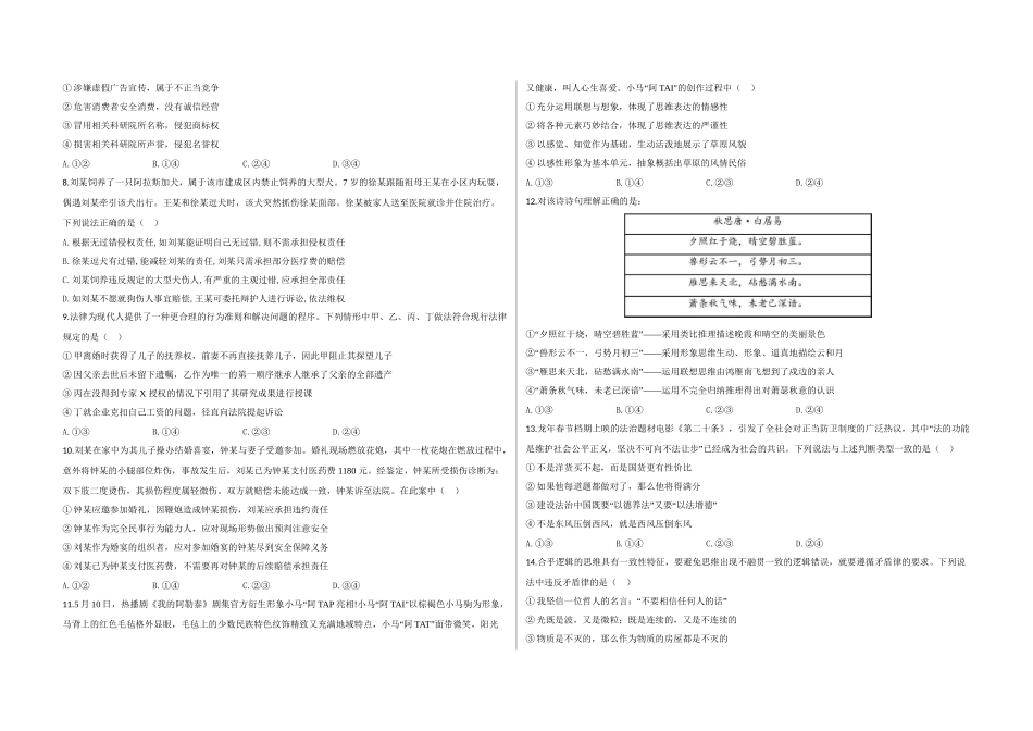 重庆市涪陵五中高三2025届2024年上期开学考试政治试题(含答案).docx_第2页