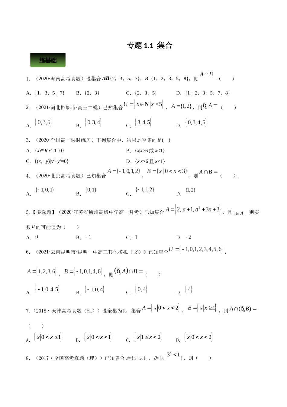 专题1.1集合1.(2020·海南高考真题)设集合A{2,3,5,7},B={1,2,3,5,8},则=()A.{1,3,5,7}B.{2,3}C.{2,3,5}D.{1,2,3,5,7,8}2.(2021·河北邯郸市·高三二模)已知集合,,则()A.B...