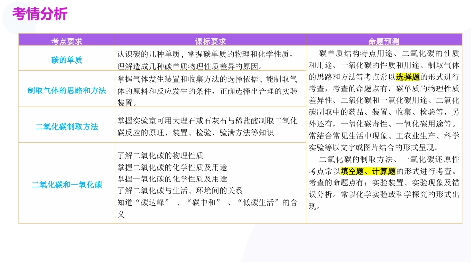 专题04讲师:xxx碳和碳的化合物目录CONTENTS01考情分析02知识建构03知识梳理04题型特训稿定PPT稿定PPT,海量素材持续更新,上千款模板选择总有一款适合你02考情分析考点要求课标要求命题预测碳的单质认识碳的几种...