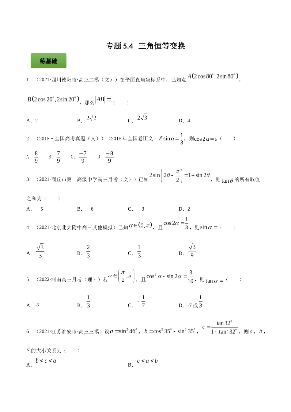 专题5.4三角恒等变换1.(2021·四川德阳市·高三二模(文))在平面直角坐标系中,已知点,,那么()A.2B.C.D.42.(2018·全国高考真题(文))(2018年全国卷Ⅲ文)若sinα=13,则cos2α=¿()A.89B.7...