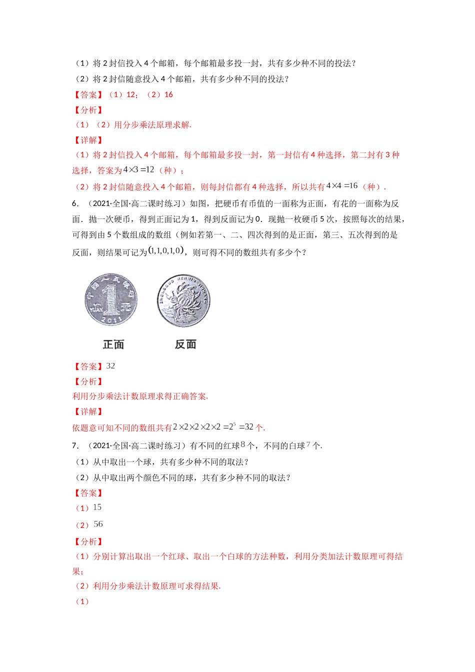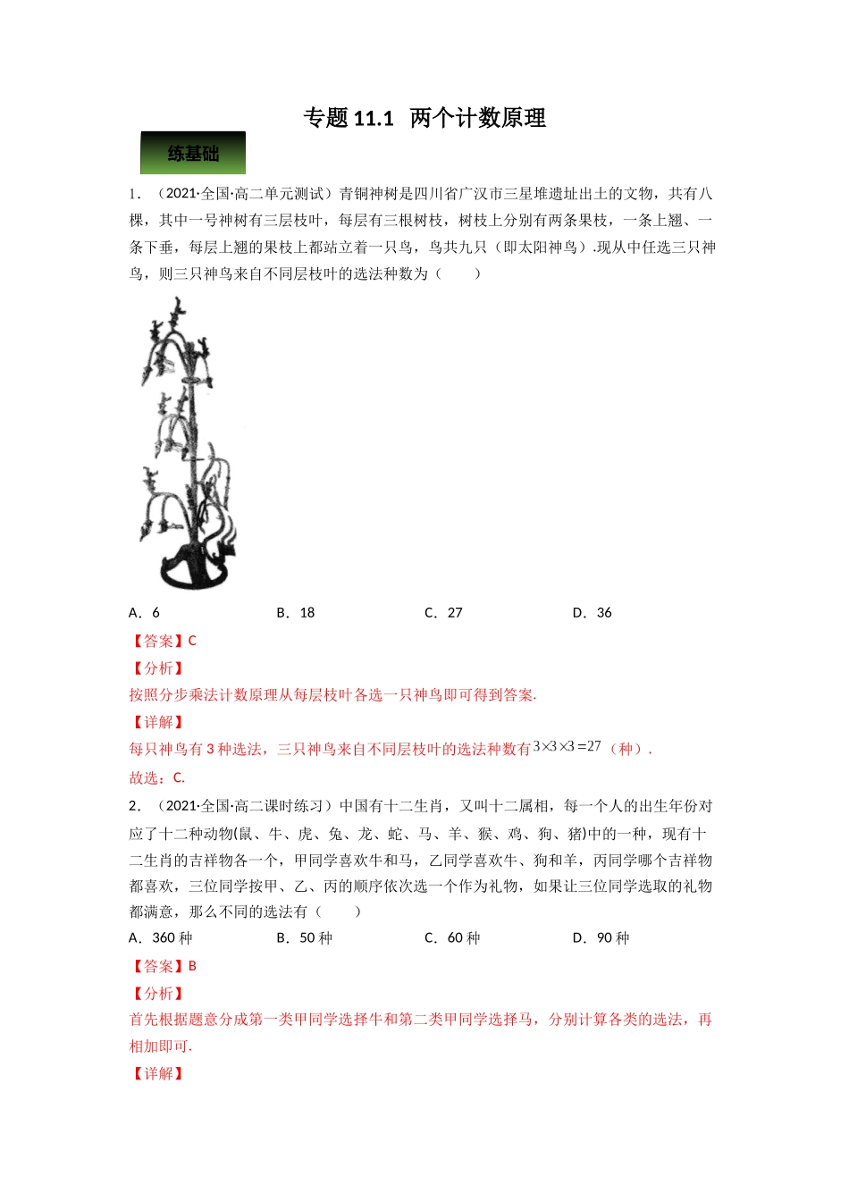 专题11.1两个计数原理1.(2021·全国·高二单元测试)青铜神树是四川省广汉市三星堆遗址出土的文物,共有八棵,其中一号神树有三层枝叶,每层有三根树枝,树枝上分别有两条果枝,一条上翘、一条下垂,每层上翘的...