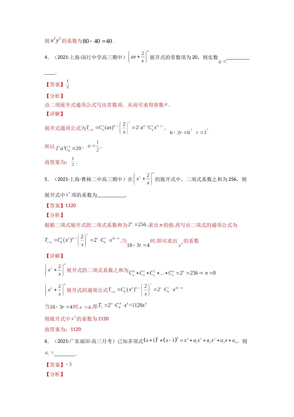 专题11.3二项式定理1.(2021·河北·藁城新冀明中学高二月考)已知=a0+a1x+a2x2+…+anxn,若a0+a1+a2+…+an=16,则自然数n等于()A.6B.5C.4D.3【答案】C【分析】利用赋值法,令即可求解.【详解】解:因为=a...