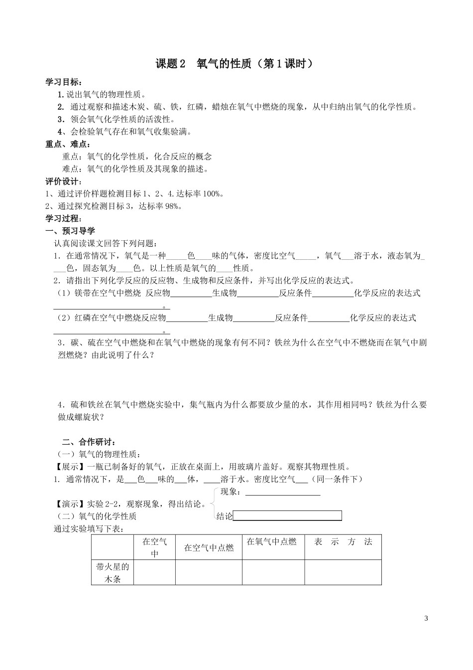 12课题2氧气的性质(第1课时)学习目标:1.说出氧气的物理性质。2.通过观察和描述木炭、硫、铁,红磷,蜡烛在氧气中燃烧的现象,从中归纳出氧气的化学性质。3.领会氧气化学性质的活泼性。4、会检验氧气存在和氧...