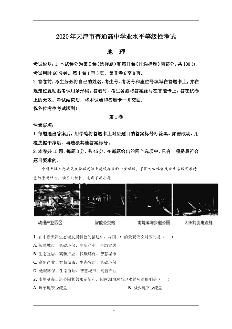 2020年天津市普通高中学业水平等级性考试地理考试说明:1.本试卷分为第I卷(选择题)和第Ⅱ卷(排选择题)两部分,共100分,考试用时60分钟。第Ⅰ卷1至5页,第Ⅱ卷6至8页。2.答卷前,考生务必将自己的姓名、考生...