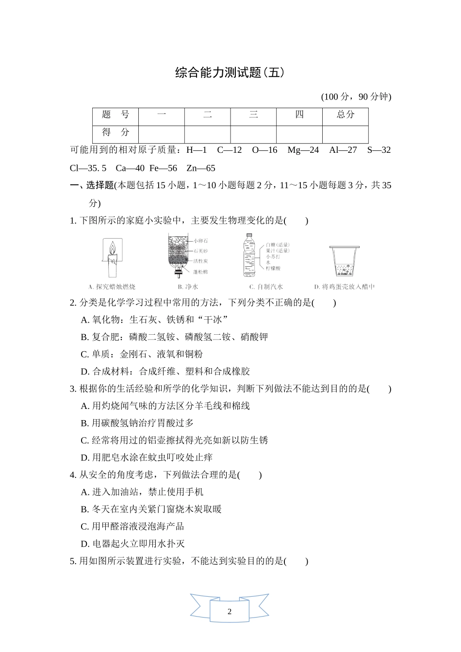 2综合能力测试题(五)(100分,90分钟)题号一二三四总分得分可能用到的相对原子质量:H—1C—12O—16Mg—24Al—27S—32Cl—35.5Ca—40Fe—56Zn—65一、选择题(本题包括15小题,1~10小题每题2分,11~15小题每题3分...