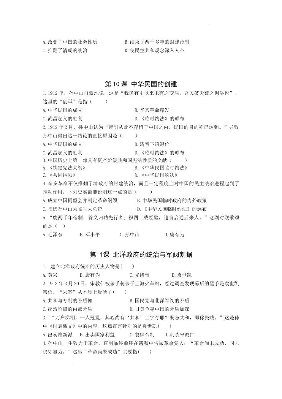 第三单元+资产阶级革命与中华民国的建立(选择题专练)2022-2023学年部编版八年级历史上册.docx_第2页