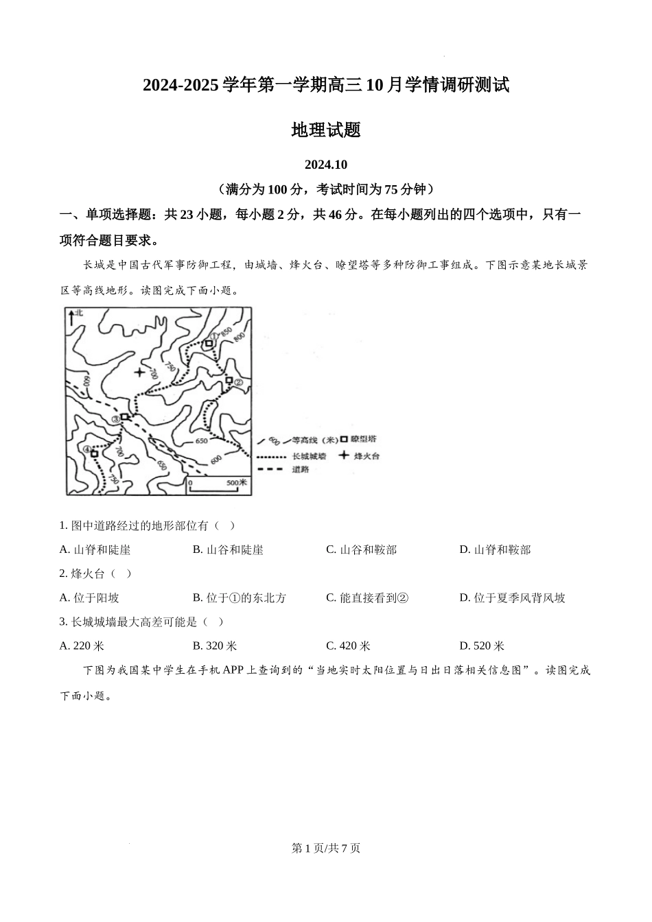 2024-2025学年第一学期高三10月学情调研测试地理试题2024.10(满分为100分,考试时间为75分钟)一、单项选择题:共23小题,每小题2分,共46分。在每小题列出的四个选项中,只有一项符合题目要求。长城是中国古代...