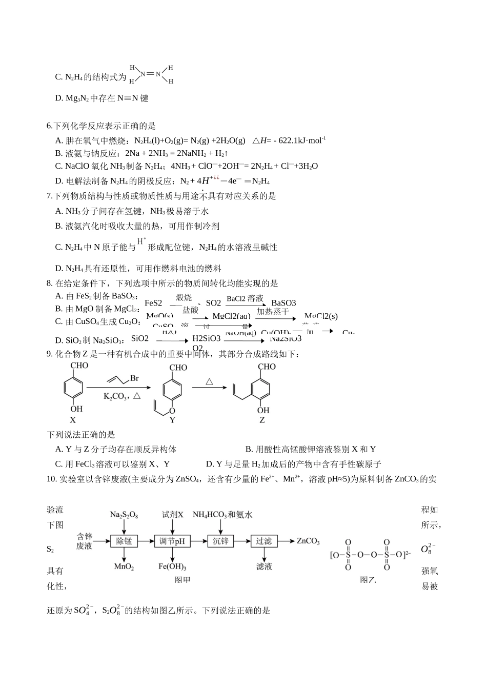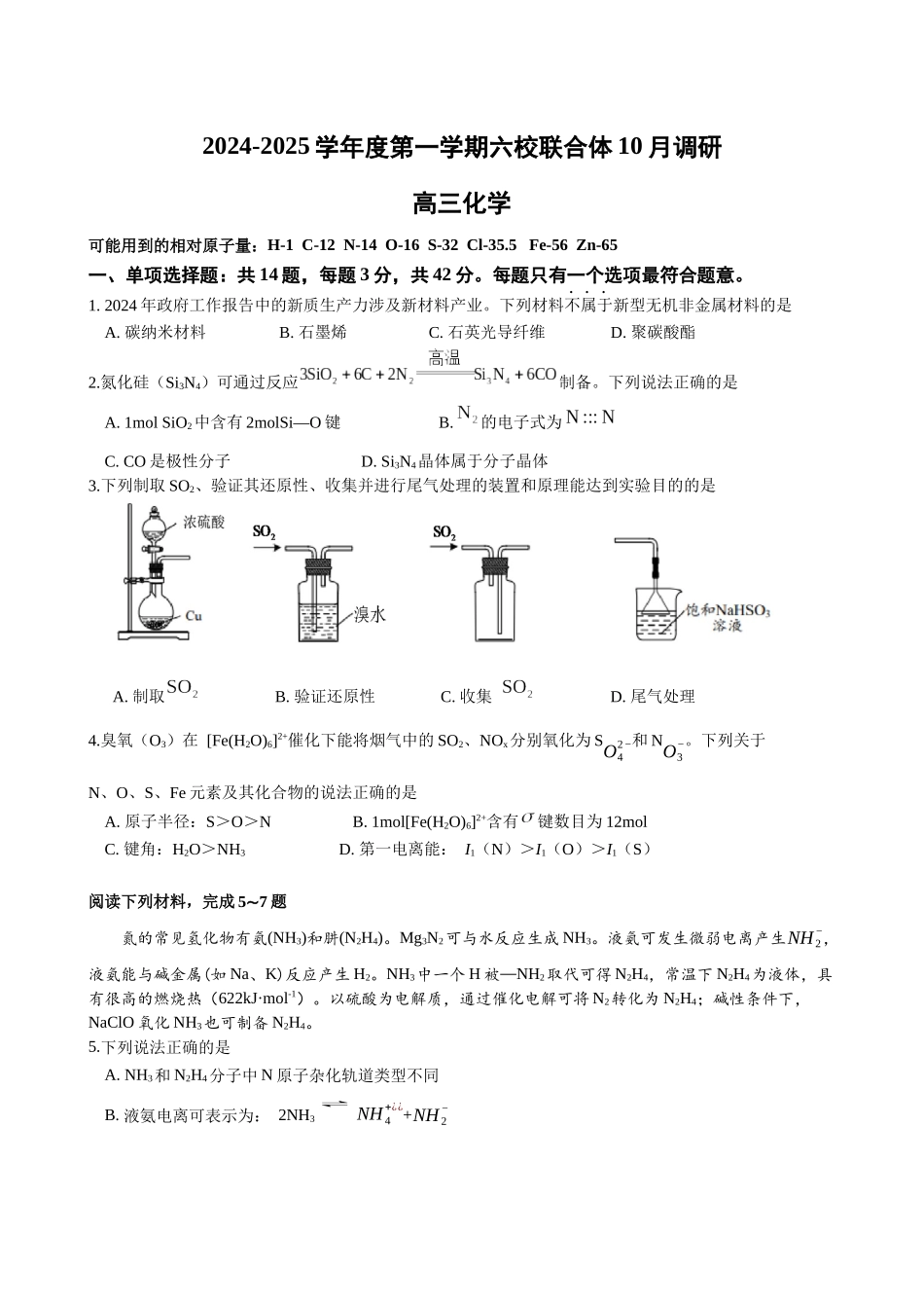 2024-2025学年度第一学期六校联合体10月调研高三化学可能用到的相对原子量:H-1C-12N-14O-16S-32Cl-35.5Fe-56Zn-65一、单项选择题:共14题,每题3分,共42分。每题只有一个选项最符合题意。1.2024年政府工作报告...