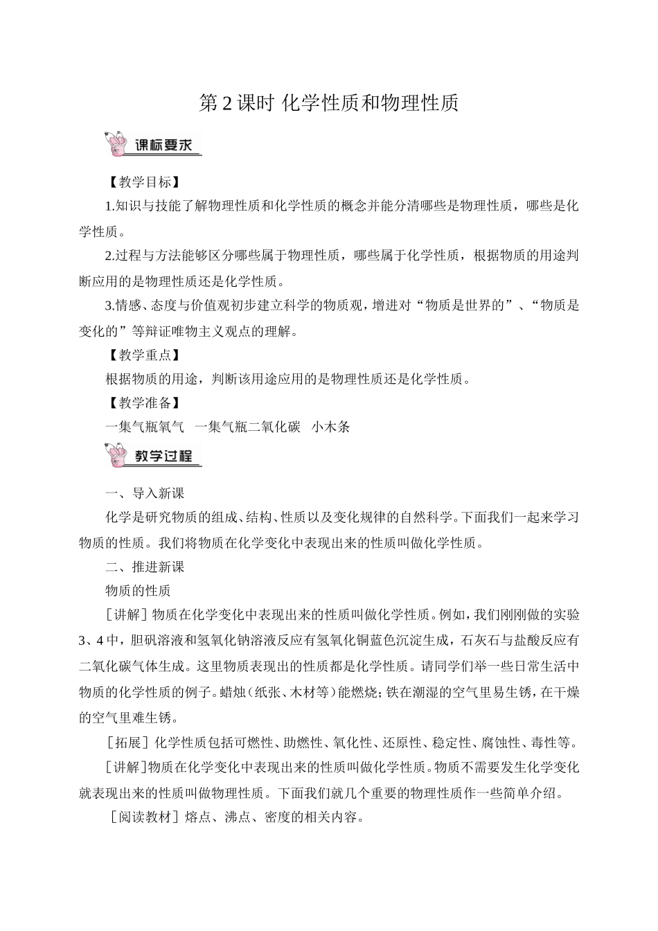第2课时化学性质和物理性质【教学目标】1.知识与技能了解物理性质和化学性质的概念并能分清哪些是物理性质,哪些是化学性质。2.过程与方法能够区分哪些属于物理性质,哪些属于化学性质,根据物质的用途判断应用的...