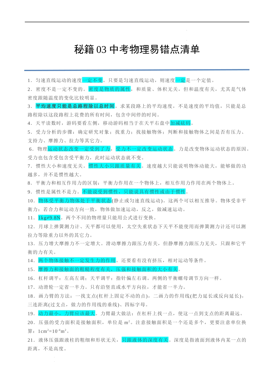 秘籍03中考物理易错点清单1.匀速直线运动的速度一定不变。只要是匀速直线运动,则速度一定是一个定值。2.密度不是一定不变的。密度是物质的属性,和质量、体积无关,但和温度有关,尤其是气体密度跟随温度的变...