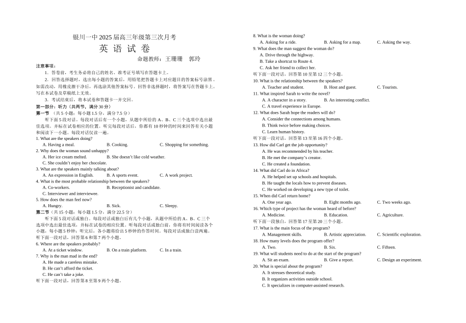 银川一中2025届高三年级第三次月考英语试卷命题教师:王珊珊郭玲注意事项:1.答卷前,考生务必将自己的姓名、准考证号填写在答题卡上。2.回答选择题时,选出每小题的答案后,用铅笔把答题卡上对应题目的答案标...