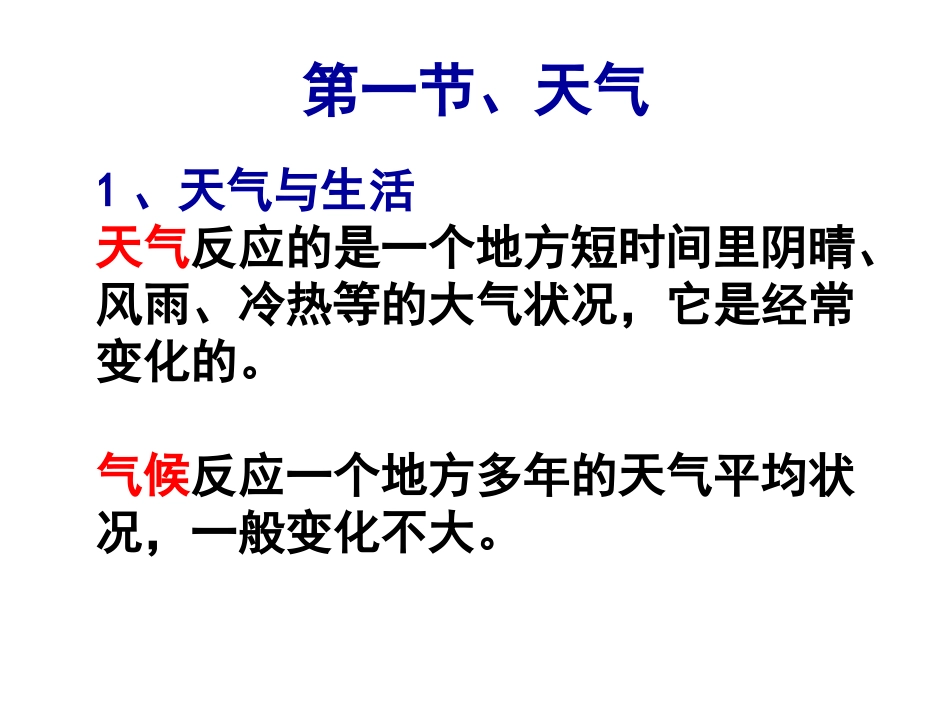 目标导入1、用实例说明天气与气候的区别;识别常用天气符号,能看懂简单地天气图。2.、阅读世界年平均和1月、7月平均气温分布图,归纳世界气温分布特点。3、计算气温日较差或年较差;判读等温线图。第一节、天气1...