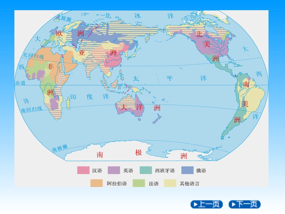 一、世界的语言二、世界的宗教▲世界的语言1.世界上有多少种语言?我们熟悉哪些语言?2.联合国的工作语言是哪六种?主要分布在哪些地区?3.英语为什么分布最广泛?▲世界的宗教4.你知道哪些宗教?5.世界三大...