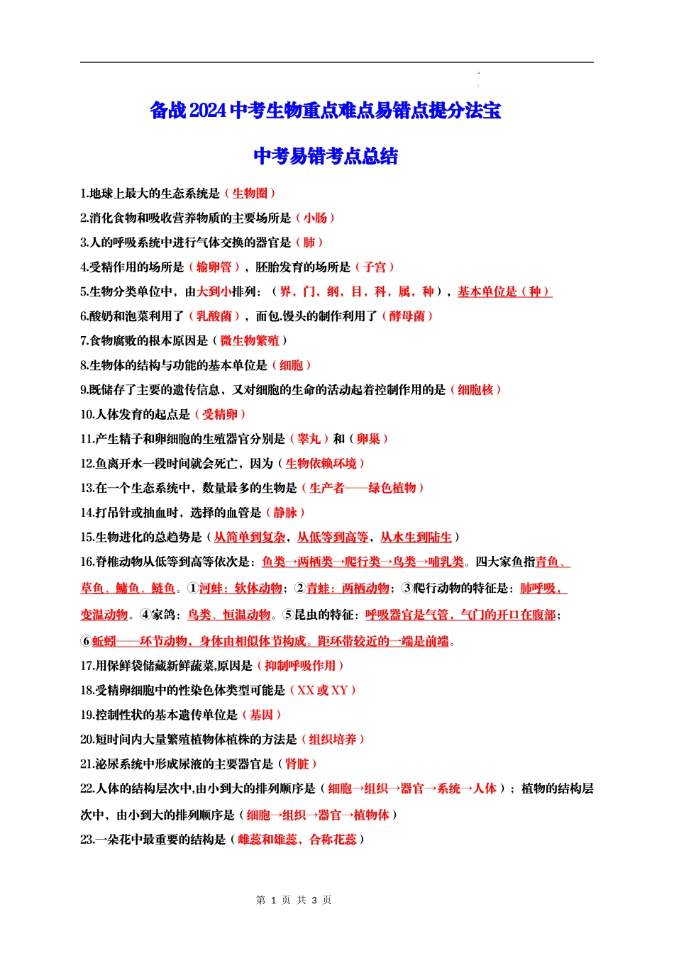 第1页共3页备战2024中考生物重点难点易错点提分法宝中考易错考点总结1.地球上最大的生态系统是(生物圈)2.消化食物和吸收营养物质的主要场所是(小肠)3.人的呼吸系统中进行气体交换的器官是(肺)4.受精作用的...