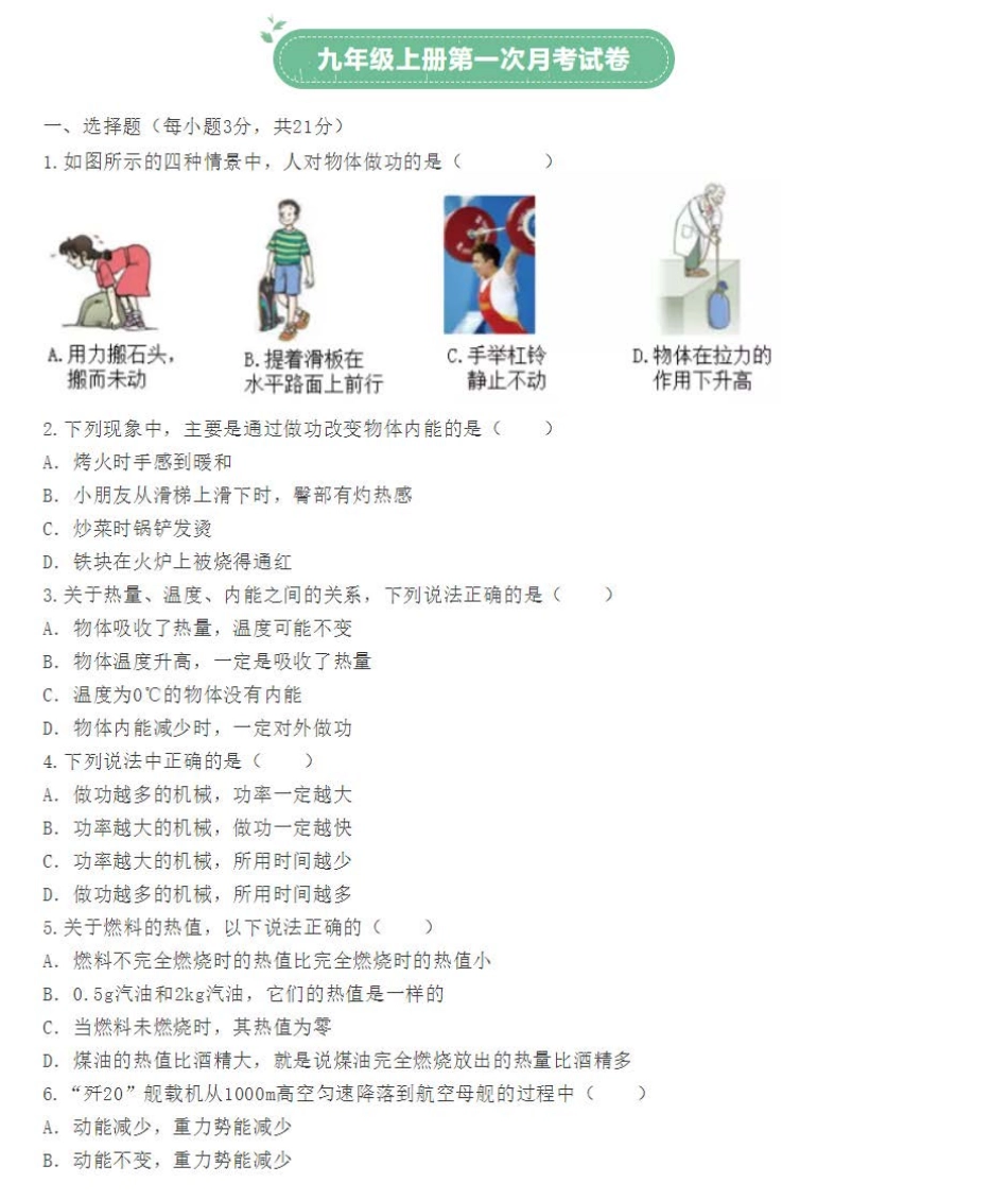 人教版物理九年级上册第一次月考试卷及答案.pdf_第2页