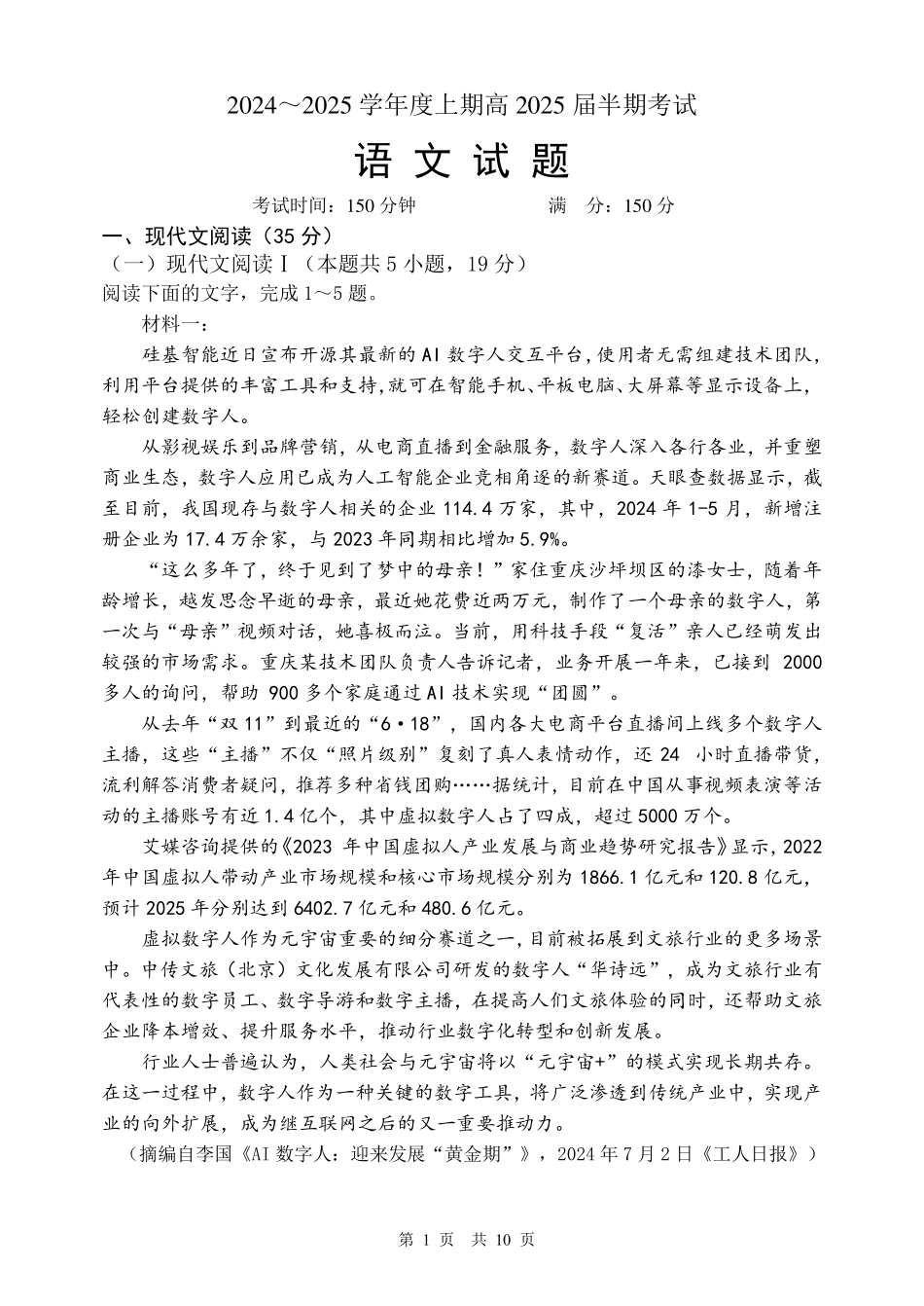 第1页共10页2024~2025学年度上期高2025届半期考试语文试题考试时间:150分钟满分:150分一、现代文阅读(35分)(一)现代文阅读Ⅰ(本题共5小题,19分)阅读下面的文字,完成1~5题。材料一:硅基智能近日宣布...