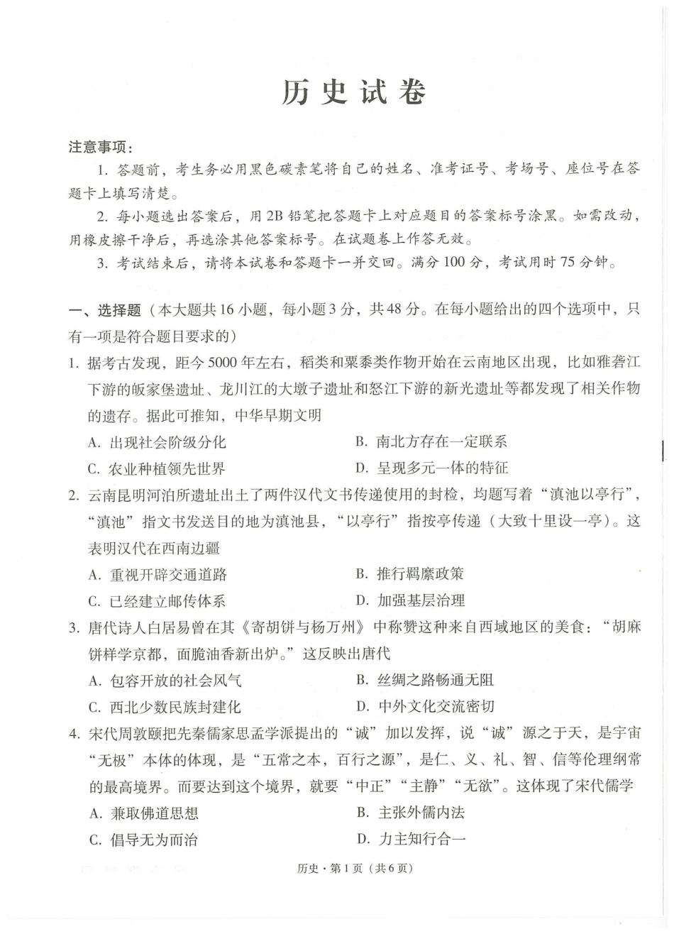 云南省云南师范大学附属中学2024-2025学年高考适应性月考卷(五)历史.pdf_第1页